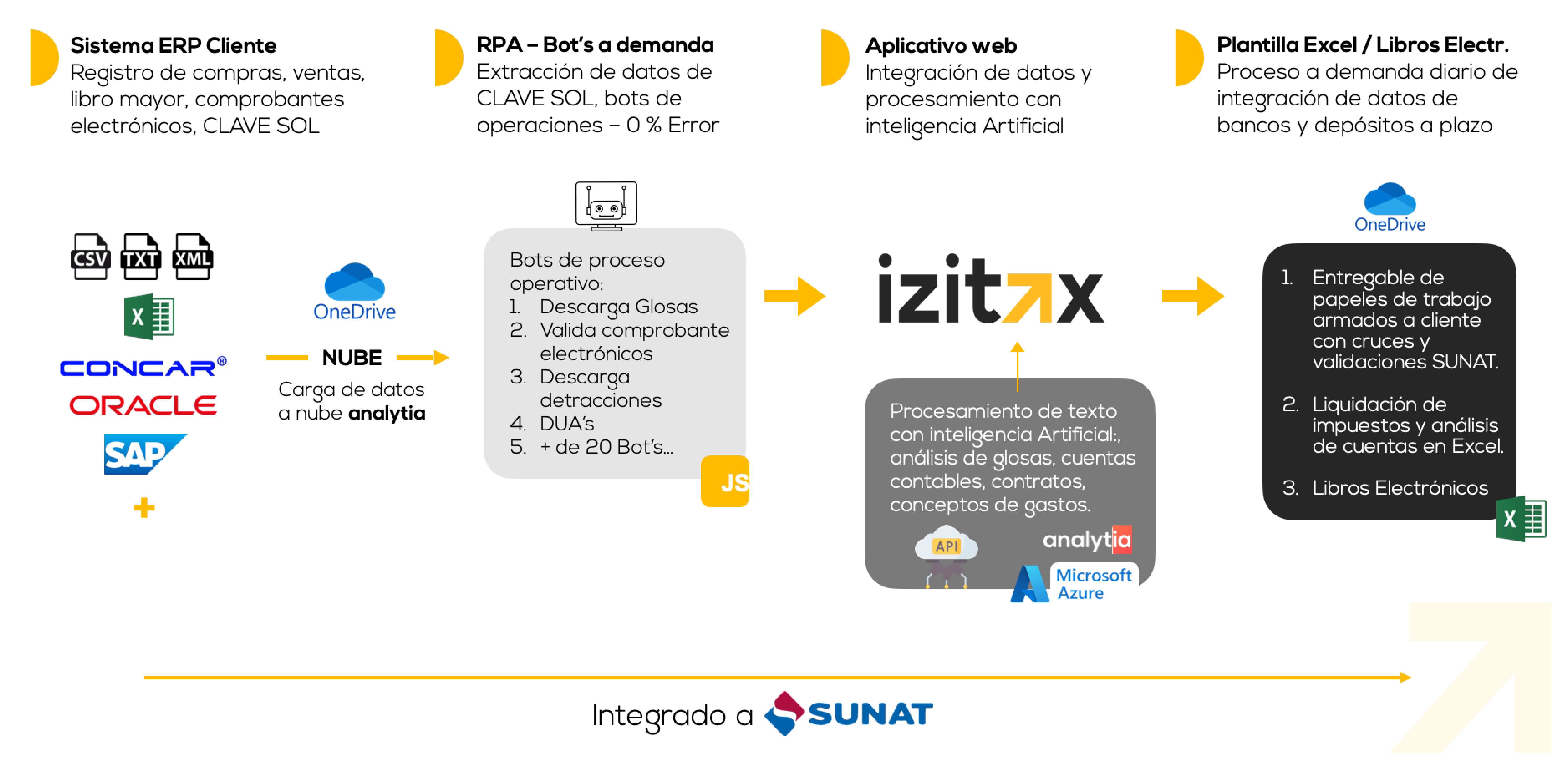 En Analytia hemos desarrollado un aplicativo web que automatiza toda la revision fiscal para la determinación de IGV e impuesto a la renta, aprovechando tecnologías como Bot’s RPA y servicios de Inteligencia Artificial logramos en pocos minutos procesar información fiscal.